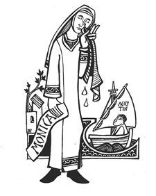 Mónica (Tagaste, actual Souk Ahras, Argelia, 331/332 – Ostia, Roma, 387), nació en una familia cristiana de buena condición social. Era todavía una adolescente cuando fue dada como esposa a Patricio, pequeño propietario y miembro del consejo municipal de Tagaste, que todavía no había recibido el bautismo. Ganó para Cristo a su marido y después consiguió la conversión de Agustín, «el hijo de tantas lágrimas». Con inmenso gozo asistió a su bautismo en la Pascua del año 387. Cuando regresaba a África con Agustín y sus amigos, murió en Ostia Tiberina, a las puertas de Roma, en el otoño del año 387, antes del 13 de noviembre. Tenía 55 años. Dos semanas antes madre e hijo habían experimentado el dulce éxtasis de Ostia, «en el cual en un supremo impulso del corazón llegaron a rozar la sabiduría hacedora de todas las cosas, dejando allí prendidas las primicias de nuestro espíritu» (Conf. 9, 10, 24). Sus restos mortales se veneran en la iglesia de san Agustín de Roma.